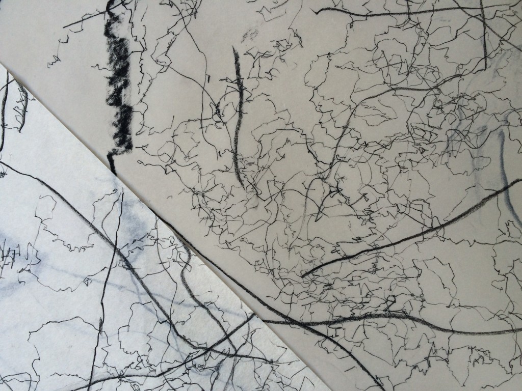 My sound explorations began with attending live concerts and making experimental direct linear drawings, mapping the folds and stretches of my body as they were happening as a result of moving-with-sound. The initial drawings looked like subterranean water maps, and consisted of a continuing line swirling over and over again, sometimes stretching and filling up the whole paper. Later, the way of drawing changed, it became more “filtered” and indirect by the use of materials like neon twine, homemade brushes, traced projected dance performances, (of my own). All these made for new mark making.